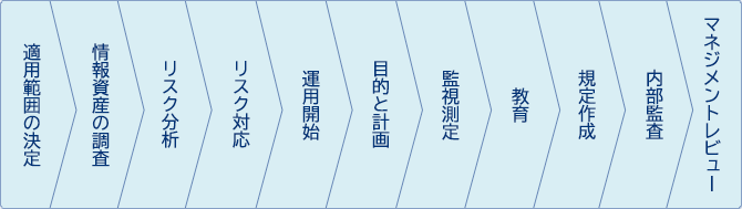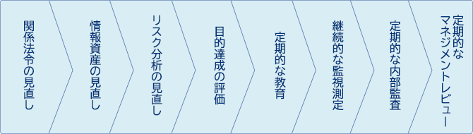 具体的には、法令一覧、資産目録、リスクアセスメントシート、リスク対応計画、目的達成度の評価等の見直しを行う必要があります。